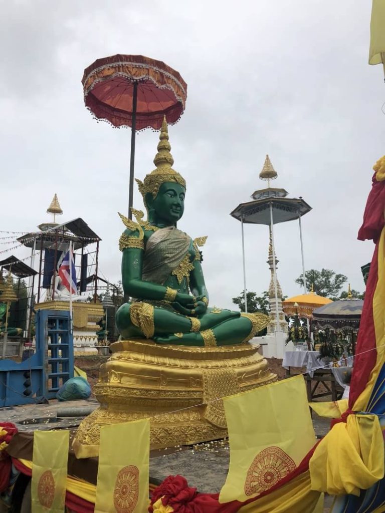 ผมก็นึกขึ้นได้ว่า คืนที่ผ่านมาได้นั่งสมาธิ ก่อนออกจากสมาธิได้เห็นเป็นพระแก้วสีเขียวองค์ใหญ่องค์นึง คิดว่าคงไม่เกี่ยวกับพระประธานที่นี่มั้ง หลวงพ่อท่านก็ถามขึ้นว่า โยมอยากรู้มั้ยว่าพระประธานที่หลวงพ่อคิดไว้เป็นแบบไหน หลวงพ่อจะเปิดรูปในโทรศัพท์ให้ดู ท่านก็หารูปในโทรศัพท์มาเปิดให้ดู ท่านบอกว่าหลวงพ่อชอบพระแก้ว กะว่าจะสร้างเป็นพระประธานอุโบสถ ผมดูแล้วก็บอกท่านไปว่าสร้างเป็นพระแก้วก็ดีครับ ในใจก็คิดว่าเรามีภาระสร้างพระ สร้างเจดีย์ที่พุทธสถานฯต้องใช้เงินอีกเยอะ คงจะรับสร้างพระประธานไม่ได้แระ ทันใดนั้นได้ยินเสียงหลวงปู่ทองทิพย์ตะโกนมาจากท้องฟ้าว่า …เฮ็ดโลด สร้างพระประธานอุโบสถ บารมีเข็ดหลาย…