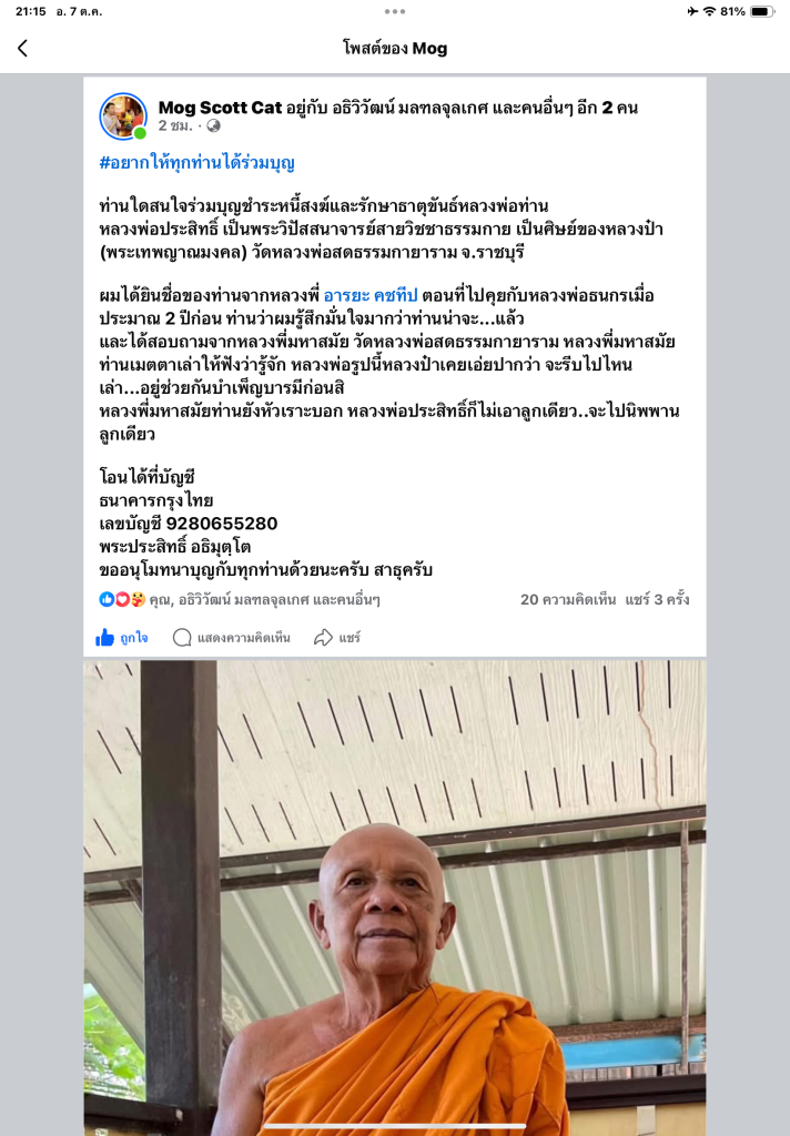 สองสามวันนี้จะถวายปัจจัยไว้เป็นค่าใช้จ่ายในการดูแลสุขภาพของท่านและค่าใช้จ่ายในสำนัก ท่านใดอยากถวายปัจจัยท่านก็โอนเข้าในบัญชีกรุงไทยนะ