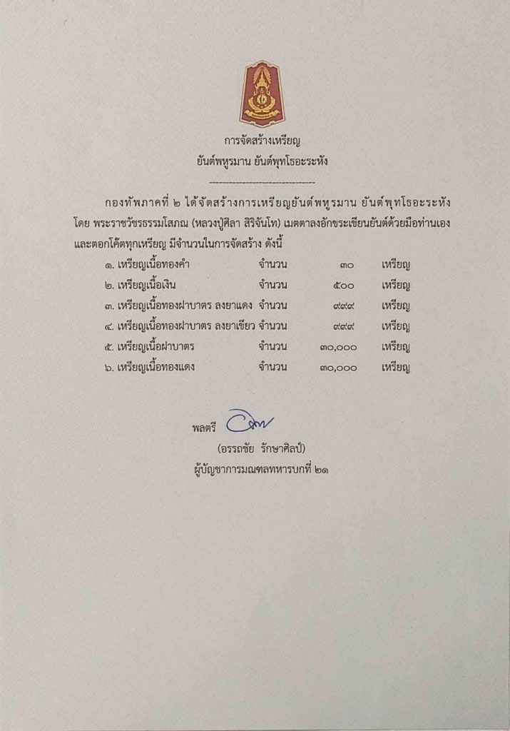 กองทัพภาคที่ 2 ได้จัดสร้างการเหรียญยันต์พหูรมาน ยันต์พุทโธอะระหัง