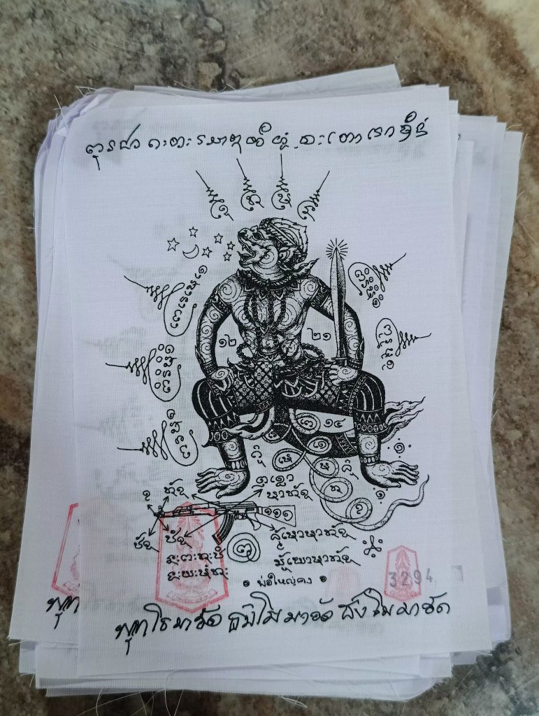 เป็นผ้ายันต์ที่หลวงปู่ศิลาเขียนยันต์และอธิษฐานจิตให้เป็นพิเศษ ซึ่งมีการปั๊มตรากองทัพและเลขกำกับชัดเจน