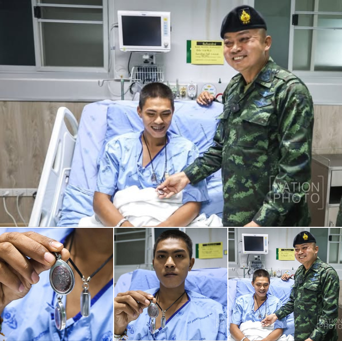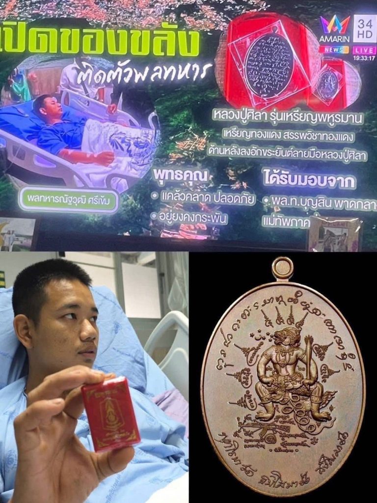 ….ท่านแม่ทัพมาเยี่ยมจึงเล่านาทีที่ตัวเองโดนแรงอัดระเบิดจากทุ่นระเบิดที่ระเบิดอยู่ด้านหลังให้ฟัง โดยนำเหรียญพหูรมานที่อยู่ในคอมาโชว์ เพราะเชื่อว่าเป็นเหรียญหนึ่งที่ทำให้ตนเองแคล้วคลาดปลอดภัย