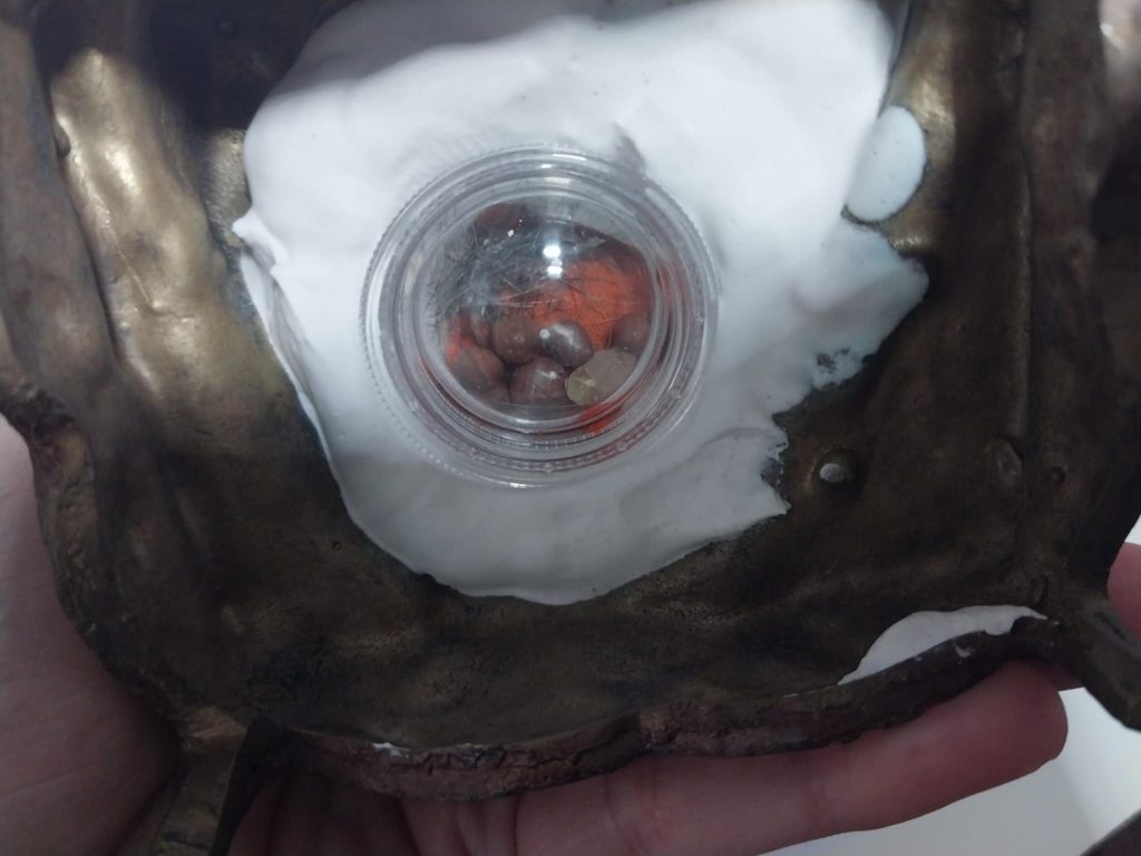 เริ่มต้นจากได้ไปถ้ำคอก ที่จังหวัดสงขลา ซึ่งเป็นถ้ำที่หลวงปู่ทวด (เหยียบน้ำทะเลจืด) ท่านได้จำพรรษาในถ้ำนี้เป็นครั้งสุดท้าย ด้วยตั้งใจไปกราบสถานที่ๆ ท่านเคยอยู่ แต่เมื่อเดินไปด้านหลังก็พบว่ามีถ้ำอีกถ้ำ มีน้ำไหลลอดถ้ำ สามารถเดินทะลุไปอีกแห่งได้ ระยะทางน่าจะราวสองร้อยเมตร เมื่อเข้าไปข้างในพบว่ามีเม็ดหินสีแดงสดใสมันวาวเล็กๆ อยู่ทั่วไป และรู้สึกเหมือนจ้องมองมา ขาไปก็ไม่ได้ใส่ใจนัก แต่พอขากลับก็อดไม่ได้ที่จะหยิบติดมือมา และพอเดินพ้นปากถ้ำมาไม่นาน สีก็เปลี่ยนเป็นแดงคล้ำ ไม่สดใสเหมือนเม็ดพลาสติกดังที่อยู่ในถ้ำ
